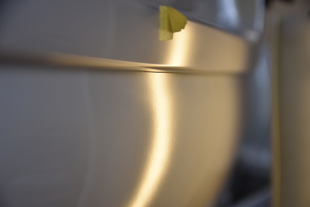 歪みが樹脂のガーニッシュの内側まで及んでいるケースなので本来であればガーニッシュも外して作業したいところですがそうなるとリヤのナンバープレートまで外さねばならず・・・今回はガーニッシュは外さずに出来るところまでということでリペアさせていただきました。中心部のパネルの伸びが心配でしたが厚みのある鉄板だったのが功を奏して!?