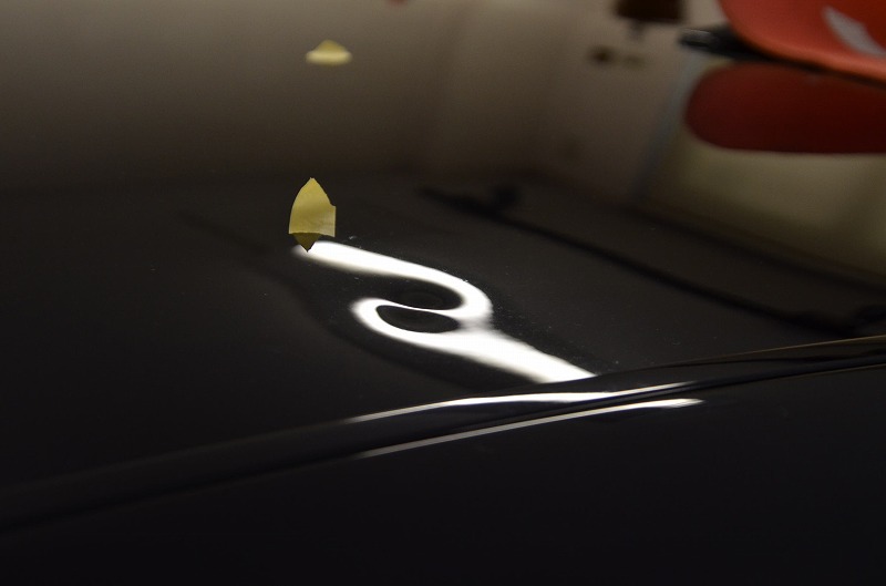 ”うわ”・・・この深さはちょっとやばいです!?LSのパネルは厚みも張りもかなりあるので簡単にはへこまないのですが、ここまで深いということはかなりの衝撃、ゴルフボール直撃も納得です( 一一) 当然ながらディーラーさんでは板金塗装で30万超のお見積り・・・