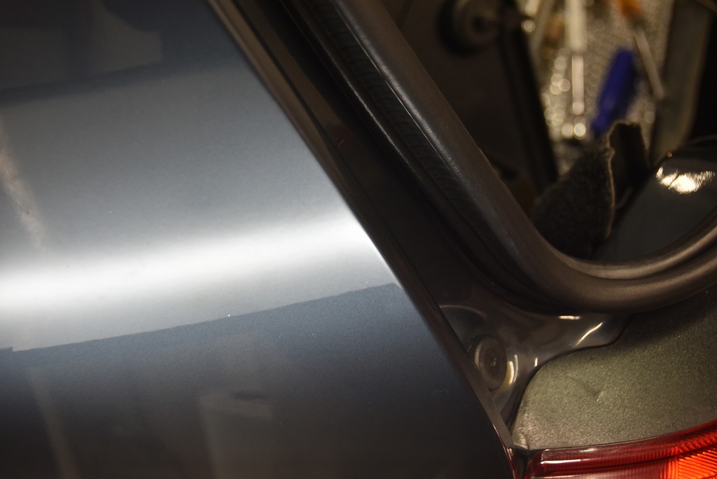 リヤフェンダーの上部、Cピラー部分に横筋状の深いへこみです・・・木の枝がヒットしてしまったそうでこちらもまたパネルの縁まで影響が及んでいました( ;∀;)