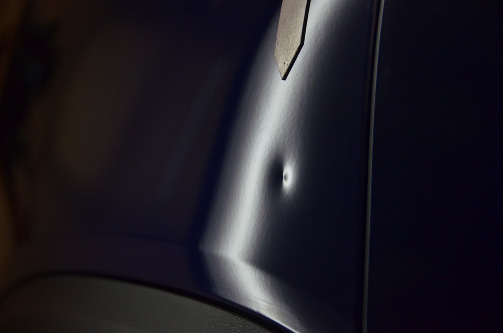 傷の状態(既にクラックは入っていないか等)、再塗装の痕跡はないか、また新車からのオリジナル塗装であっても経年劣化や普段からのお手入れの差による劣化等含めて・・特にこのような深いへこみの場合は仕上げ段階で針の先のような尖った先端のツールでプッシュするため塗装面の状態が悪いと簡単に塗装割れが発生することもあるため深追い出来ず最終の仕上げに影響が出る場合もあるのです。