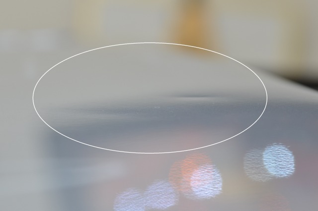 これは?・・・うちのスクールで受講生の方と一緒に実験した実習用のドアパネル。2箇所歪が見えるかと思いますが奥の方が軽くハンマーで叩いて作ったへこみ、そして手前がコンパウンドで”ゴシゴシ”擦った結果出来たへこみ^_^;
