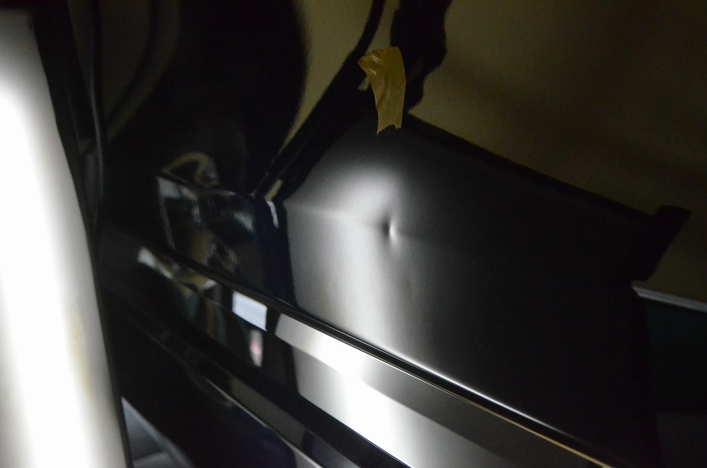 こちらは奥様がドアを開けた際にフェンスにぶつけてしまって出来たへこみとのこと、プレスライン上も含めて複数のリペアとなりますがドア下部なのでこちらも内張り脱着が必須となります。