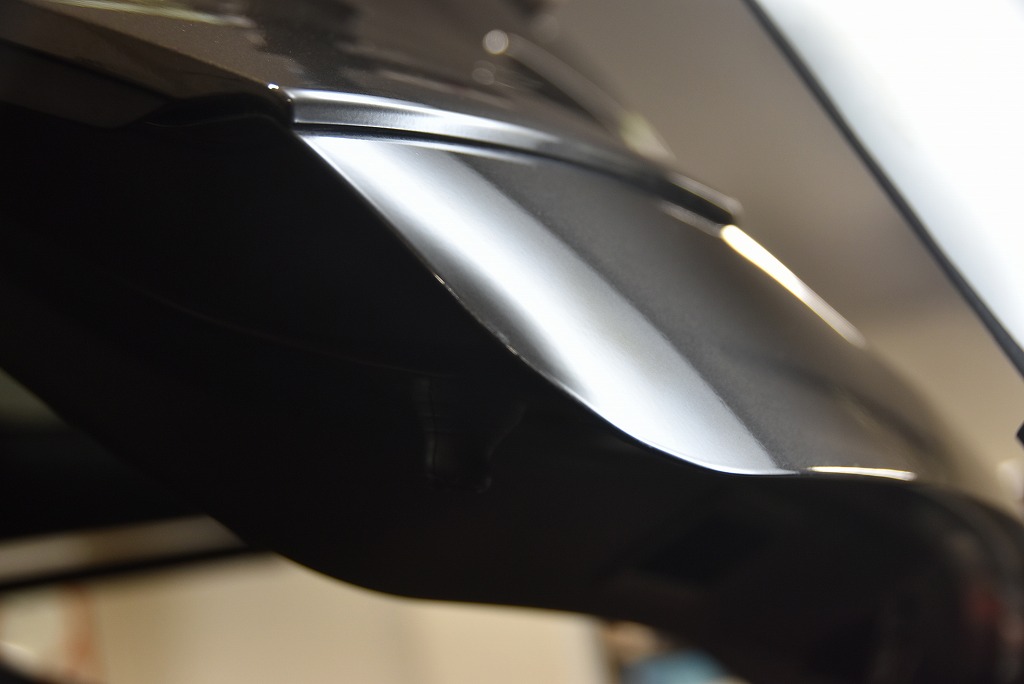 この画像ではわかり難いかもしれませんが縁が少し内側に折れてしまって映り込みが??っとなってます。最近の車は手を使わずとも足でバックドアの開閉が出来るのが多いですからね・・・とても便利な反面意図しない場面でうっかり開いてしまうということもあるので要注意です(>_<)