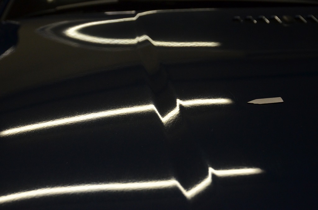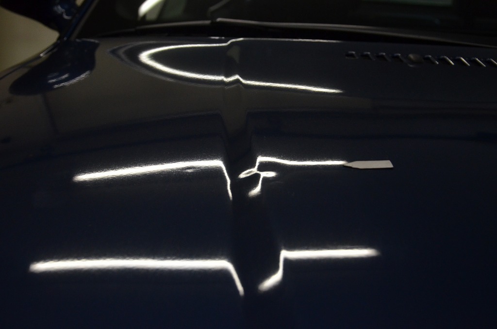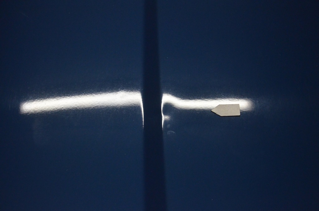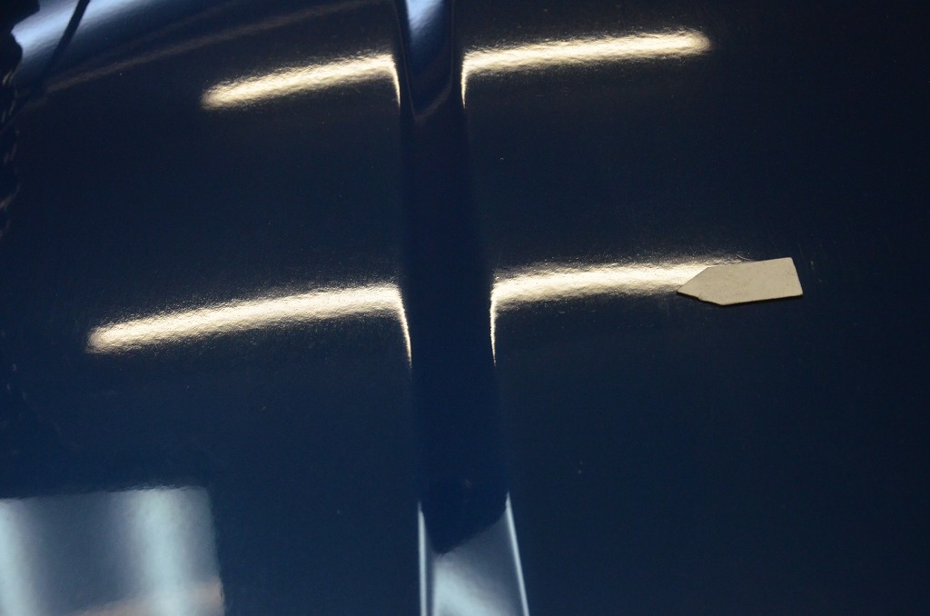 複数リペアなので明日までのお預かりとなりますが、こちらはボンネット、真上から見た感じではプレスラインにかかるかかからないか位に見えるかと思います・・・が!?角度を変えて(低い位置から透かして・・)見ると・・・