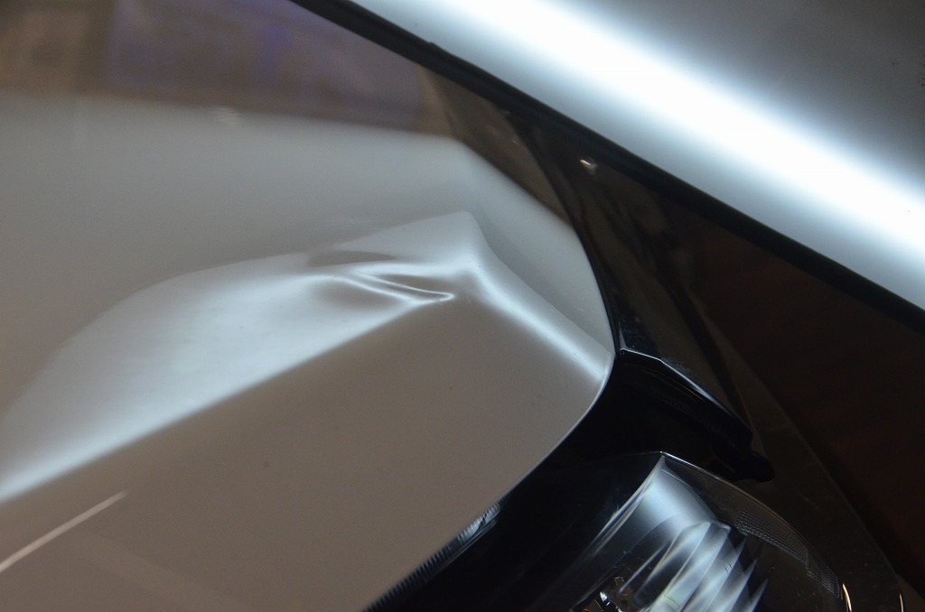 相当な力が加わったものと推測出来ますが塗装面に致命的なダメージはなさそう(線傷は付いています・・)、また一般的にボンネットの先端付近は工具アクセスが不可又は厳しいことがほとんどですがこちらは問題なくアクセス可能でしたので何とかお役に立てると判断、オーナー様には傷及び若干の歪みが残る旨をご了承いただいての集中作業となりました。