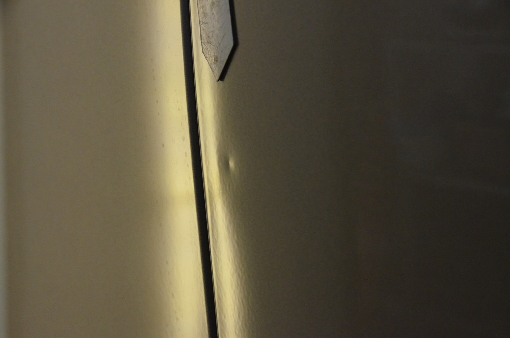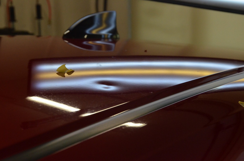 リペア後・・・まず普通に見る分にはわからないレベルですが最初のご説明通り傷と折れ線(叩いてぼかしています・・)が残っています。それでもオーナー様に確認してもらうも”もう全然気になりません”ととてもご満足していただけました。