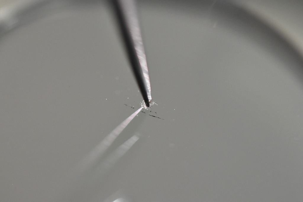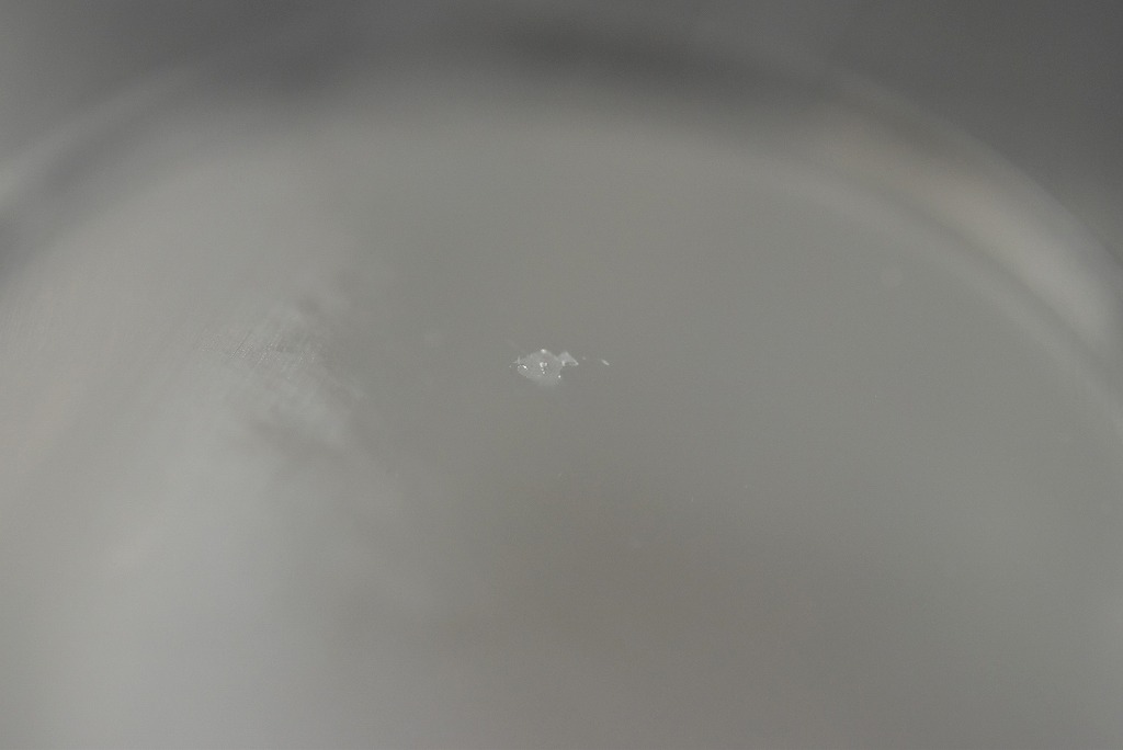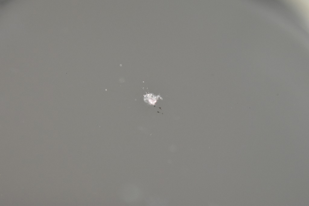 最初店頭で拝見した際には、これはチッピング(表面の欠け)のようですね!っと一瞬判断したのですが・・・再度店内で見やすいように裏に鏡を設置してルーペで確認してみると何やら黒い点々が!? ちなみにこれはマクロレンズで撮影しているので肉眼よりも傷の状態が鮮明に見えるのですがここから更にヒビがあるか否かをチェックすると!?