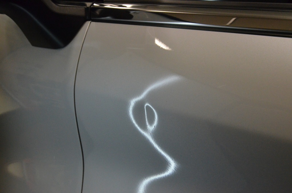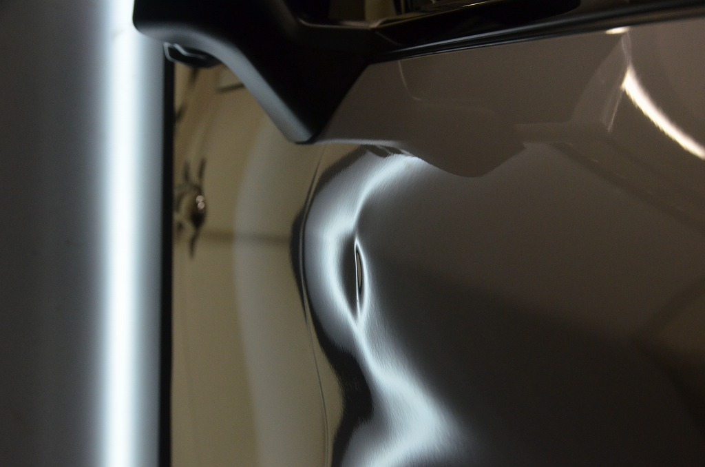 フロントフェンダーに映り込みがぱっくり割れている箇所が実測で5センチ程のへこみ・・・のようですが!?正面からではなく斜めから透かした状態でチェックすると!?