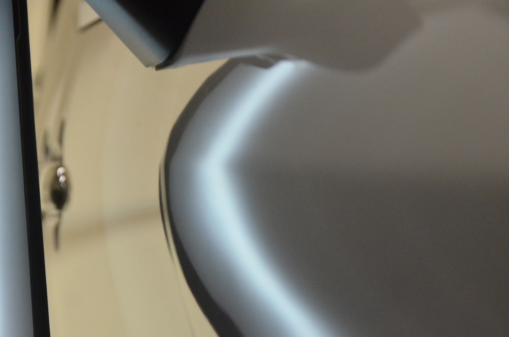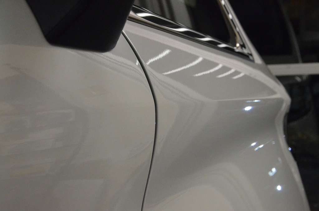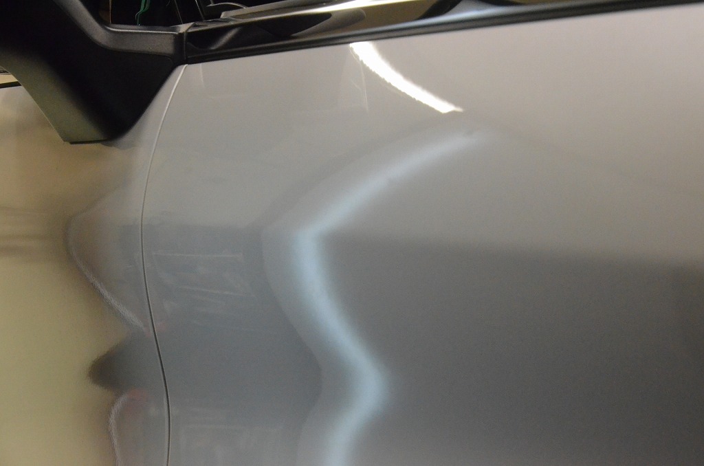 一気に全体の表情が変わってしまいましたね(@_@) へこみの原因は洗車の際にオーナー様ご自身の膝がヒット(>_<)・・・このようにプレスラインを跨いで強くへこんだ場合にはへこむだけではなく力が逃げて周囲が盛り上がってしまうことが多々あります。今回は実測で約12センチ程のリペア作業となります。