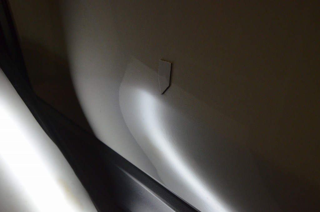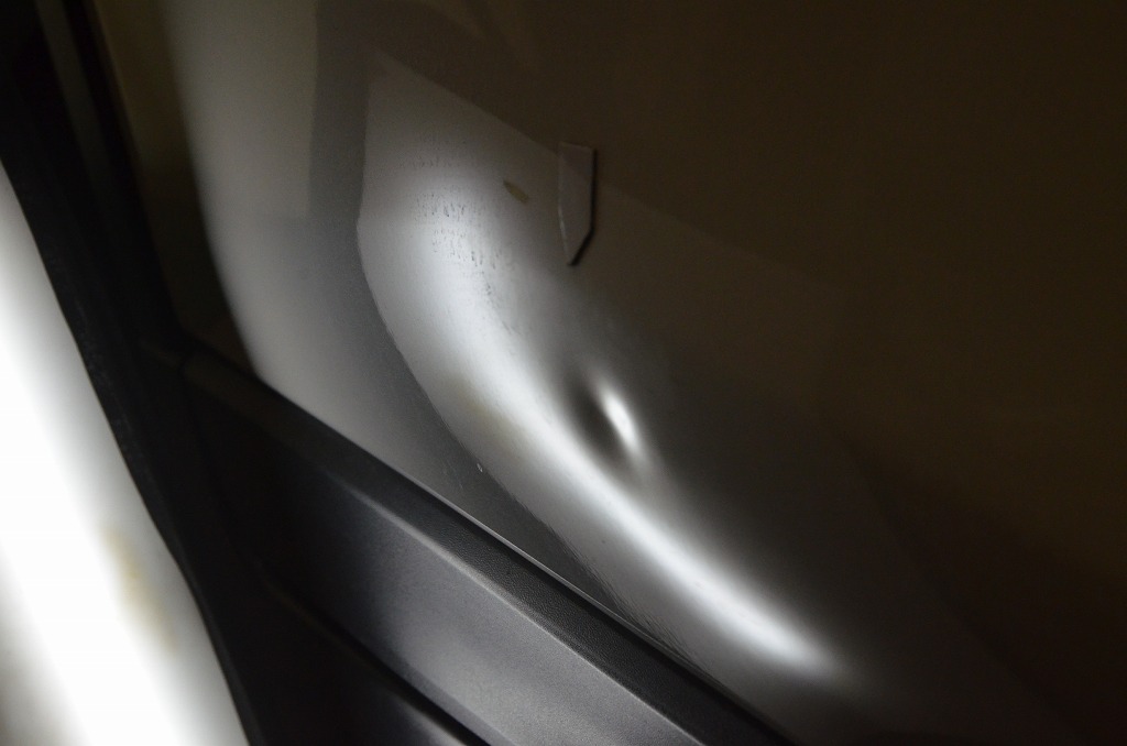 なかには同時に数台を入れ替えながらお持ち込みいただくこともあります。こちらは本日作業した中から・・・日産エクストレイルのリヤドア下部のへこみ。