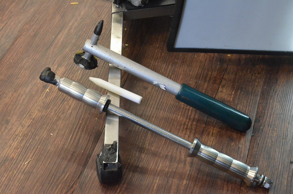 ちなみに今回のリペアで使用した工具はこちら・・・内張りを外せば工具が届く場所ですが脱着工賃が掛からないプーリング法、また浅いへこみなので通常のホットグルーではなくコールドグルー(ブチルゴムのような素材です)による引っ張り、そして出した後に叩くハンマーとポンチの3点のみ!という極めてシンプルな工法です。現在はユーチューブ等でもリペア動画を見ることが出来ますが簡単そうに見えても実際はとても難しいので(^^; 決して真似されることのないようくれぐれもお気をつけくださいませ。