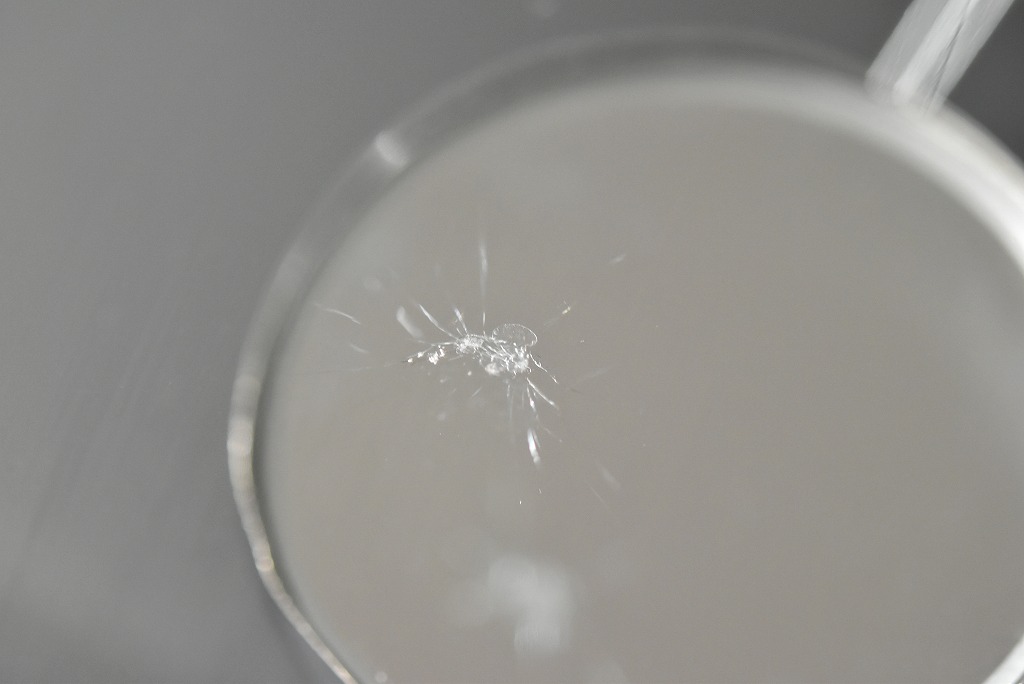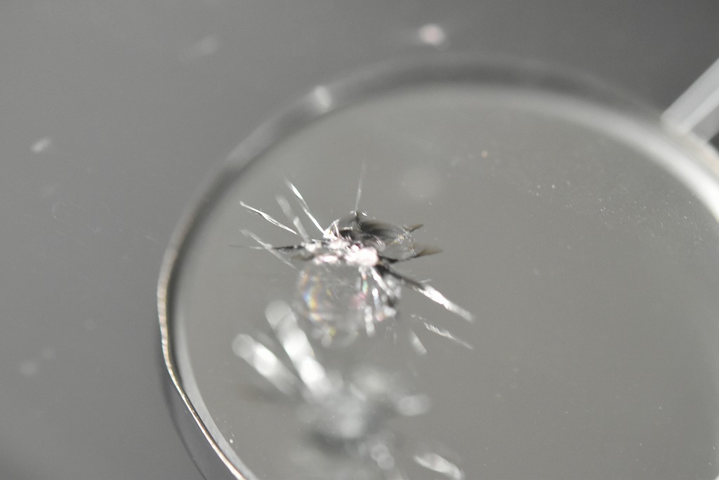 衝撃点(表面の欠け部分)が少し大きく複雑な形状ですね、このようなに複雑な形状や場所(ガラスの縁に近い等)になるとディーラーさんはもちろん、カー用品店や自動車ガラス屋さんではリスクを回避して無難に”ガラス交換”をお勧めされることが多くなるかと思います(^^; そうならないように常日頃リペアに関してはリペア専門店にご相談されることをお勧めしていますが・・・