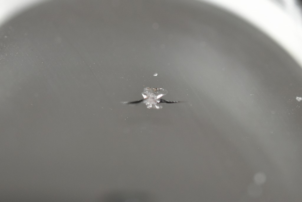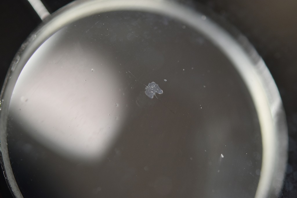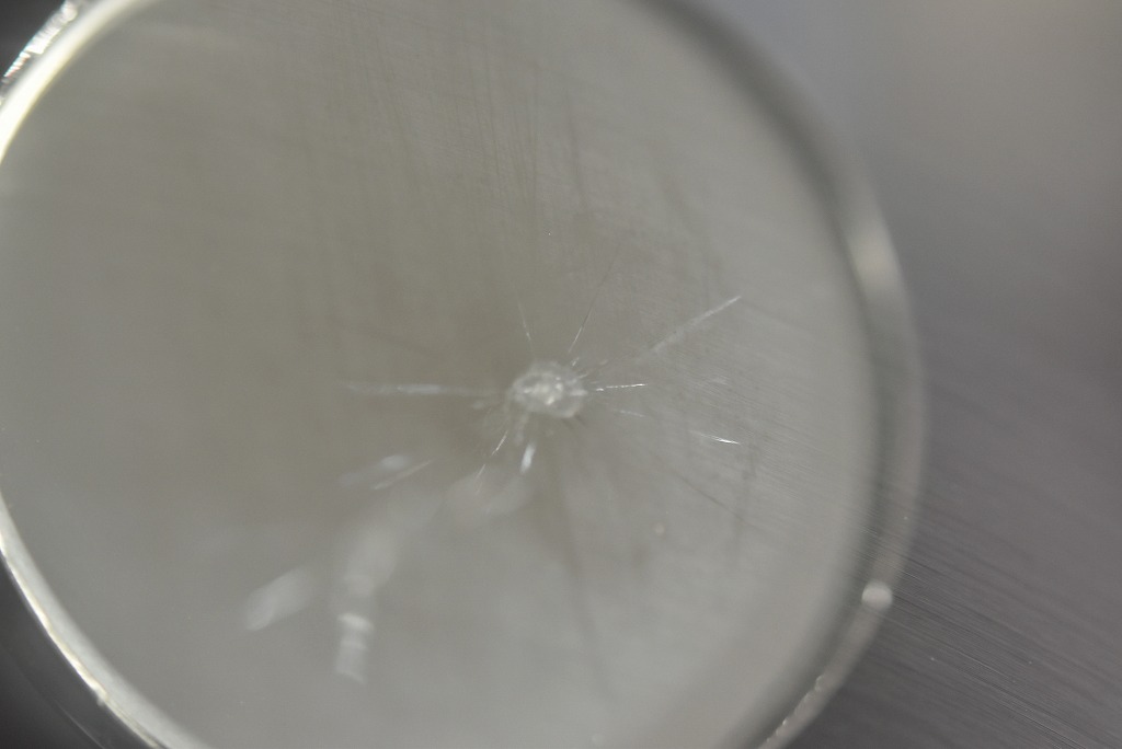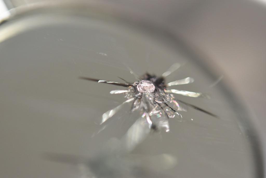 肉眼では確認し難いことからオーナー様は表面が欠けているだけのチッピングなのか否か判断に迷うとのことでしたので店内に入れて早速確認(一眼レフ&マクロレンズでの撮影です・・)すると!?明らかにヒビがあるのでやはりリペアが必要な飛び石痕となります(^^;