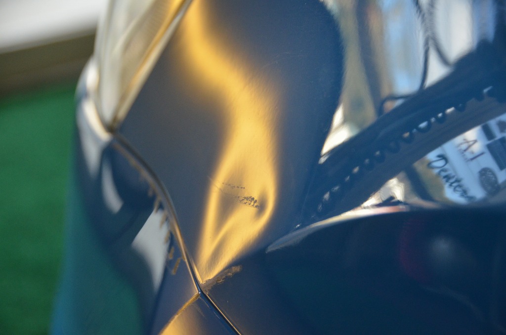 動きながら擦って出来たへこみなので傷も少し深いですね。停止状態で出来るエクボやドアパンチと違い傷の有無に拘わらず中心が深く損傷していることも多く一般的にはデントリペアよりも傷も含めて通常の鈑金塗装の方が綺麗に仕上がるので無理にリペアをお勧めはしていません(^^;