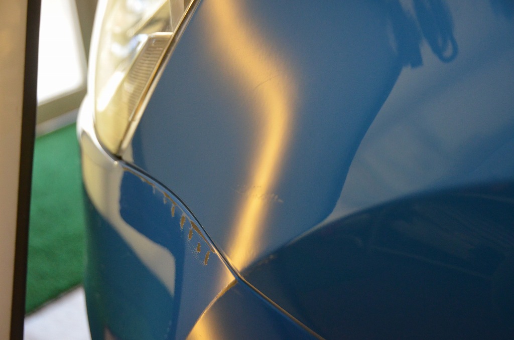 それでも今回はオーナー様のご意向で現状よりも目立たなくなればOKとのことでお引き受けさせていただきました。またフロントフェンダーの場合は工具アクセスが容易なことに加えて傷も磨けば薄くなりそうだったので一定以上の仕上がりが望めると判断しての作業となります。