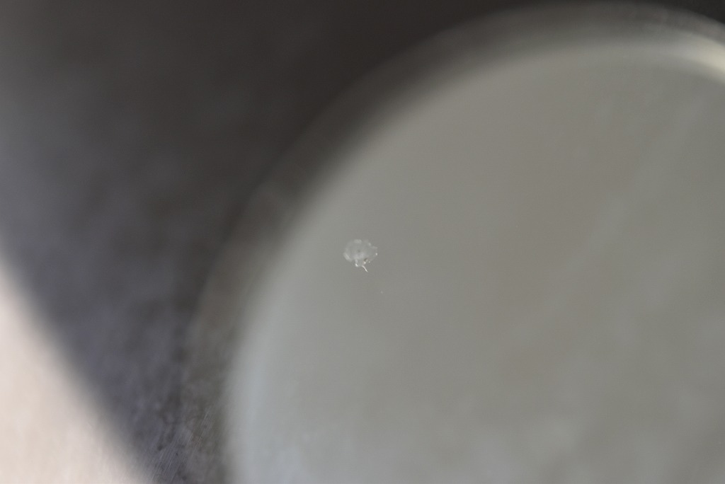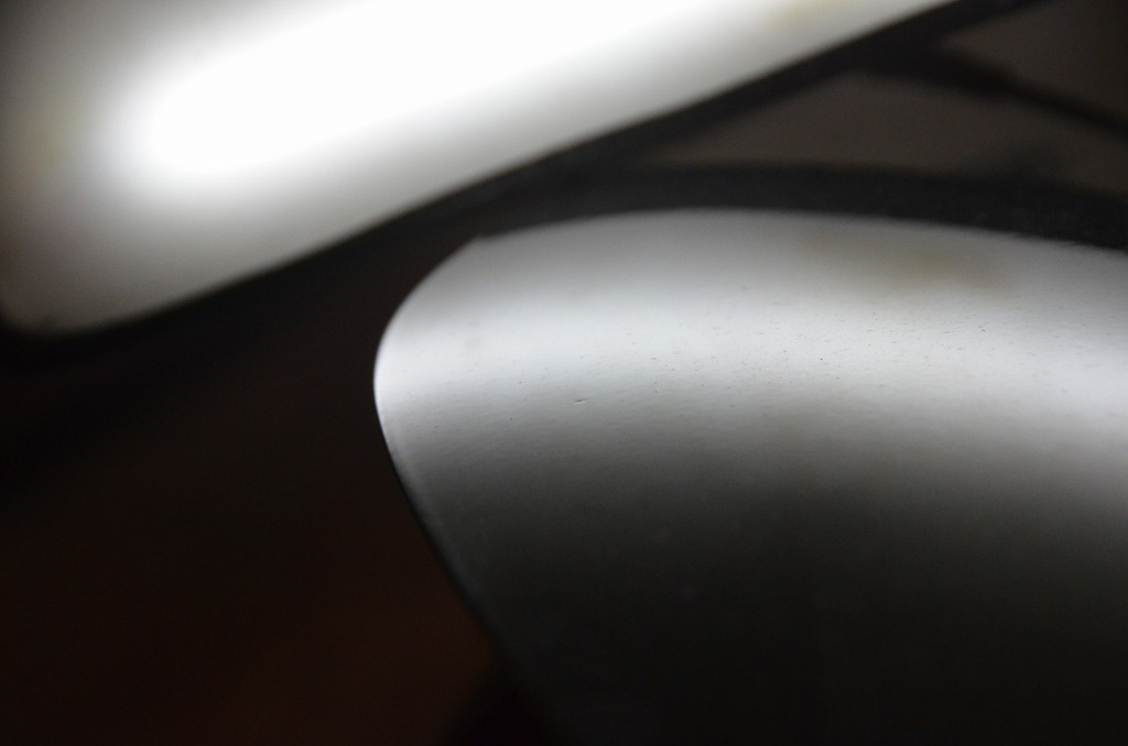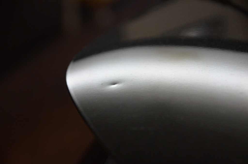 お電話で伺った際には表面の欠け(チッピング)のみかと思いましたが直接拝見すると!?厳密に見ると内部に向けてのヒビがある状態でした。ほんの僅かなのでおそらく車検もOK、またヒビが伸びるリスクも非常に少ないかと思いますがオーナー様も少しでも心配をなくしたいとのことでしたので通常の工程通りのリペアにて対応させていただきました。