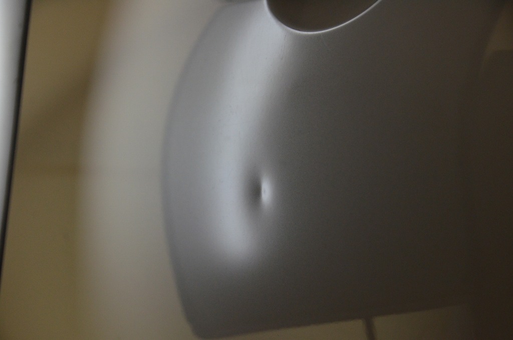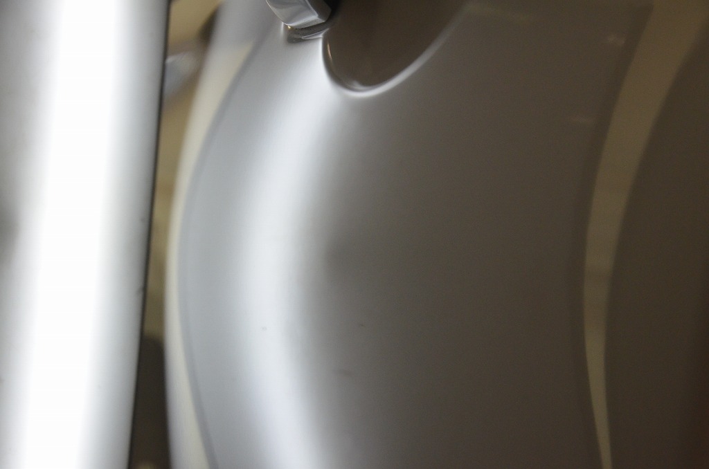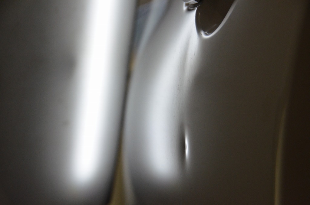 少し斜めから確認すると・・・当たった箇所のみならずその上部まで歪みが及んでいるのがおわかりいただけるかと思います( ;∀;) このような一点集中の深いへこみの場合パネルの厚みや場所等により伸びが物理的な限界を超えてしまいリペア不可になってしまうこともあるので慎重な見極めが必須、今回はぎりぎりリペア可能と判断、とは言えかなり難易度が高いケースなので慎重に作業させていただきました。