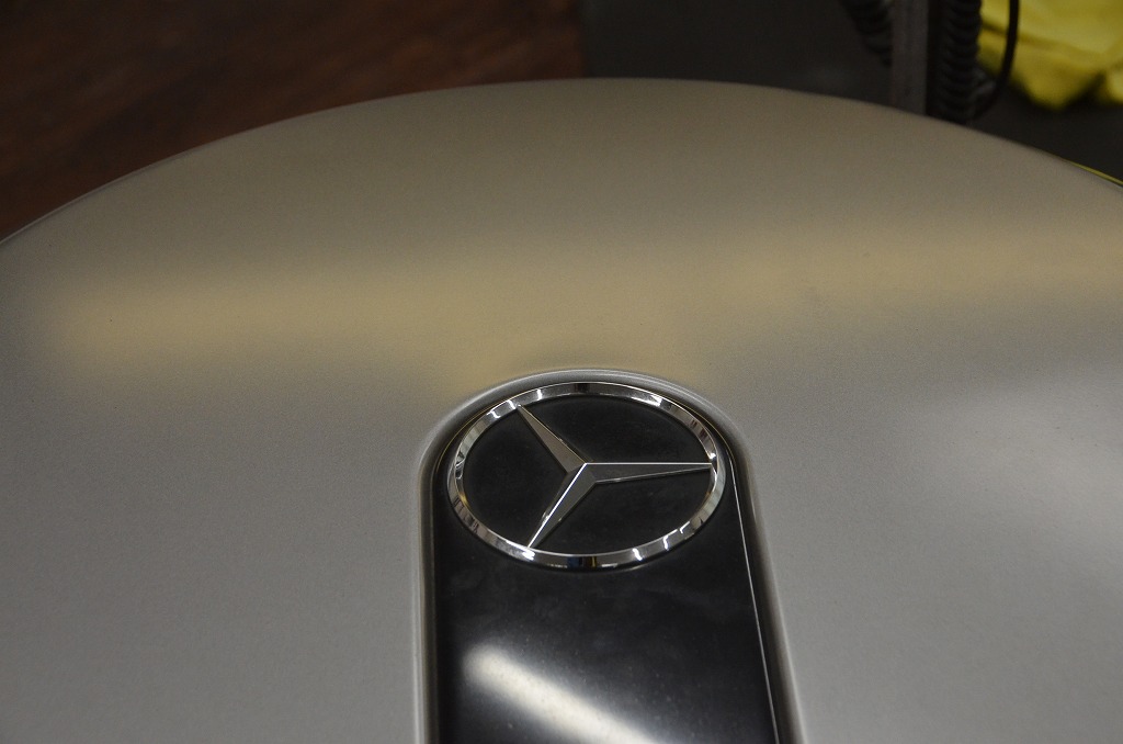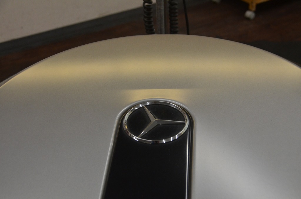 メルセデスベンツGクラスのアルミ製のタイヤカバーです。車両から外してのリペアとなりますががっちり固定出来ないとかなり厳しい・・・それ以上に厳しいのが塗装がマット(艶消し)仕上げということ!?筋状に深い箇所が傷になっているため出来れば仕上げ段階でコンパウンド等で磨きたいのですがこの塗装、磨いてしまうと普通に艶が出てしまいリカバリー不可能となりますので要注意・・・パーツ単体なので交換すれば良いのでは?と思いましたが(^^; どうやらこのマット塗装仕様はとても高価とのことでして・・・