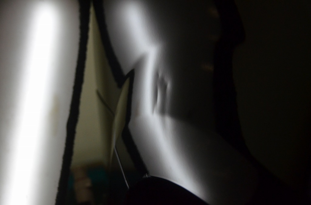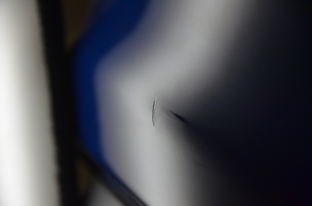 少し複雑なへこみですね、オリジナルの塗装面は艶もあり綺麗ですがやはり年式が旧いのでプーリング法ではなく確実に裏から押せるか否かがリペア可否のポイントになります。こちらは幸いにもフロントフェンダーだったので!?