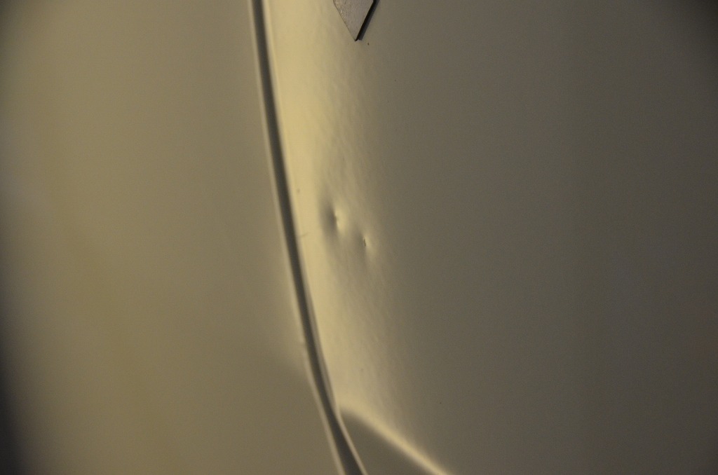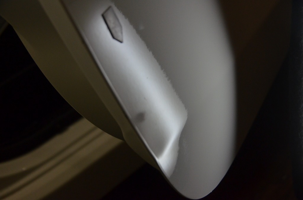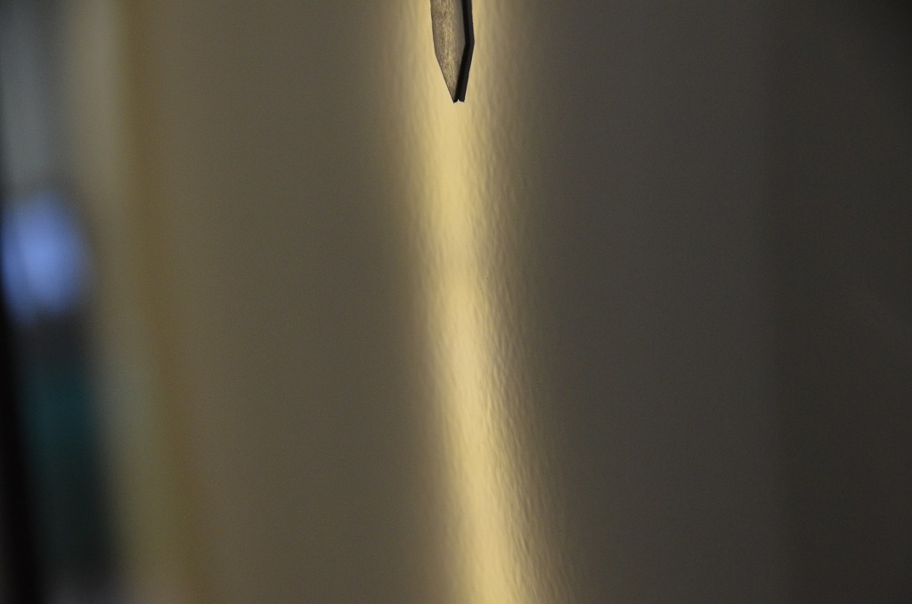 こちらはリヤフェンダーの縁に近い場所に・・・ご自宅で自転車が倒れて出来てしまったとのことですが!?その手前に筋状の浅いへこみ(歪み)が確認出来ます!?もう少し手前なので・・・ずらして撮影すると!?