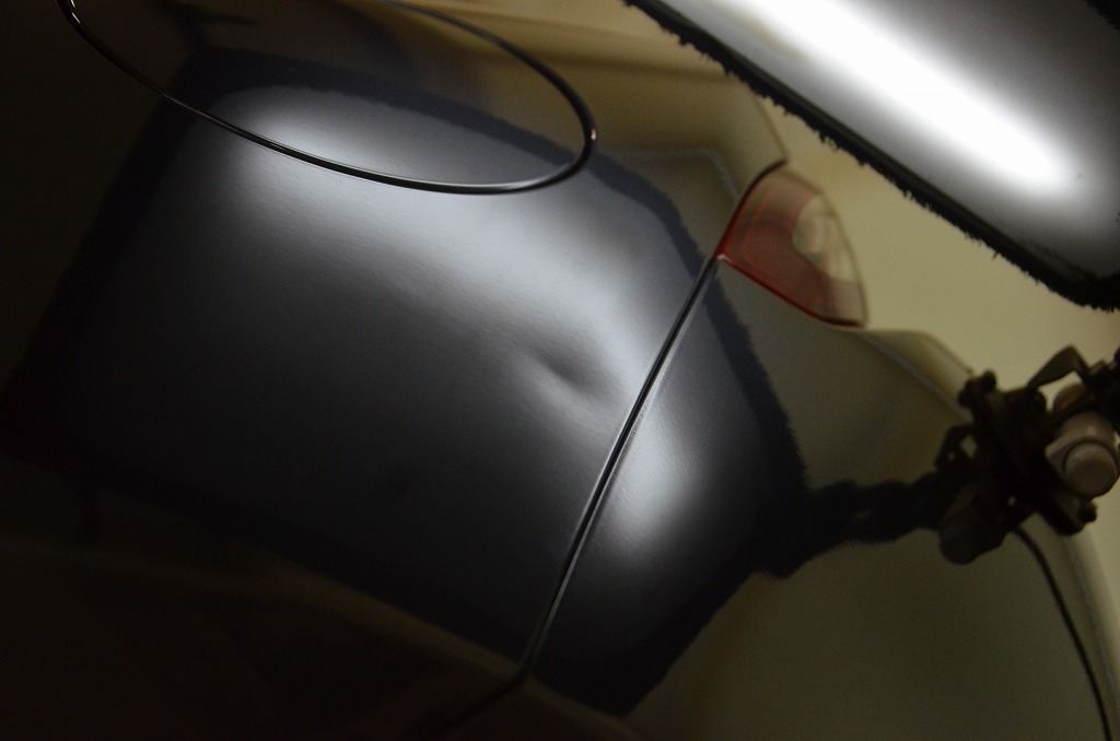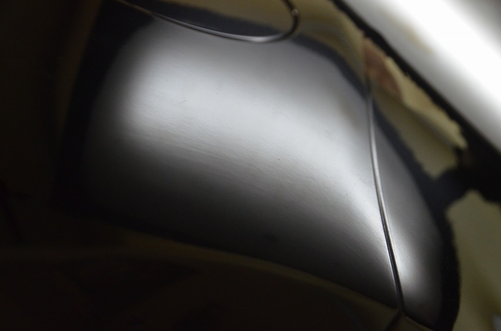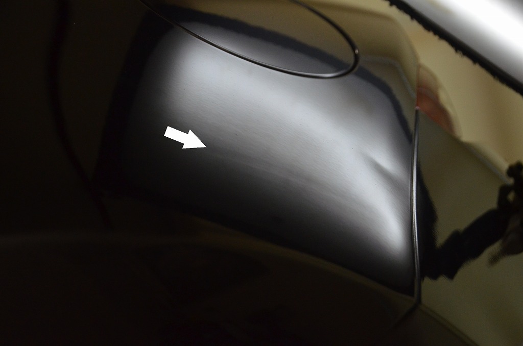 10センチ程の筋が確認出来ますね・・・実はこちらは過去に傷を直すために鈑金塗装されたとのことですのでおそらく経年劣化によりその痕跡が目立ってきたものと思われます。今回はこの筋状の浅い歪みも一緒にリペアさせていただきました。