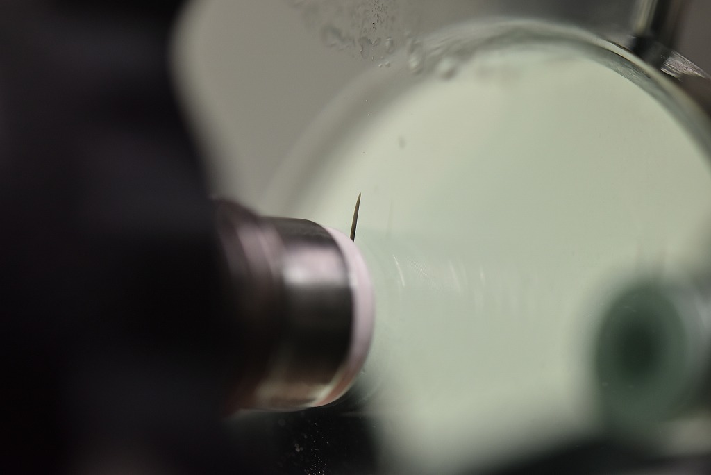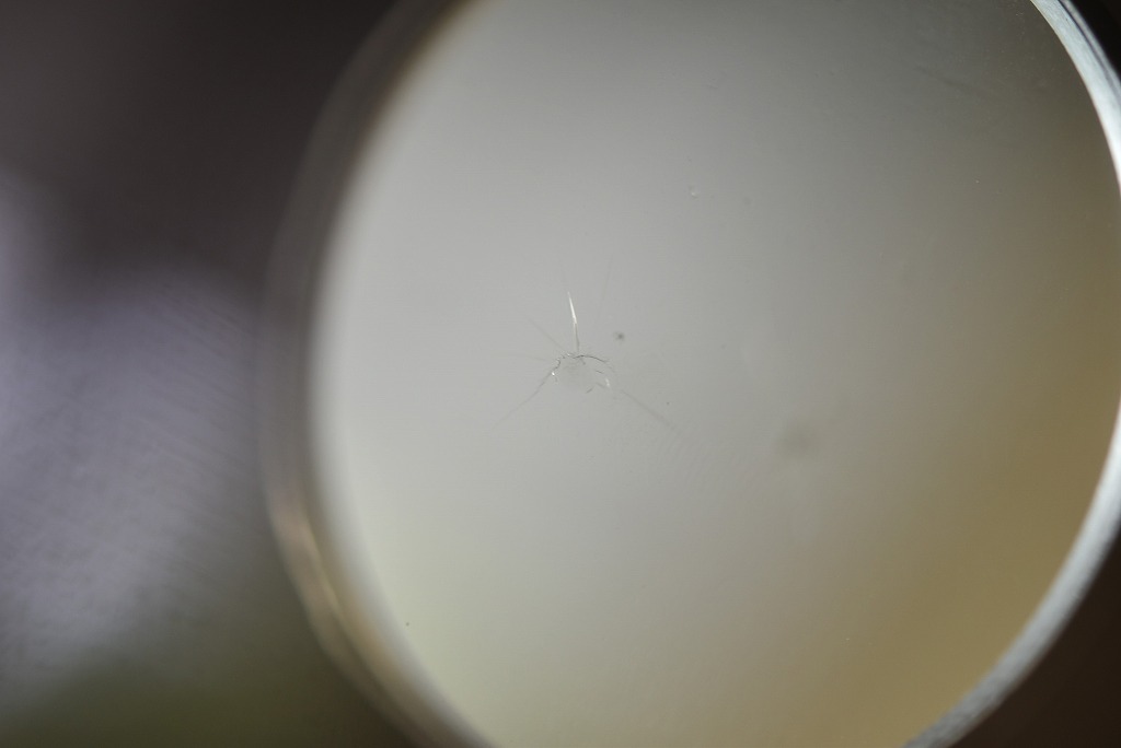 すぐにご相談いただけたのですんなりいくかな?と思いましたがヒビの一本だけなかなかレジンが浸透せず(+_+) 全てのヒビの先端まで浸透してしまえばあとは固めるだけとなりますが時間をかけてもこのように入らないこともあります。さて?その時はどうするのか?・・・レジンが通る道筋(ヒビ)に微細なゴミやガラス片で塞がっていたり、又は完全に繋がっていないこともあるのでその道筋が出来るようあの手?この手?で対応いたします。