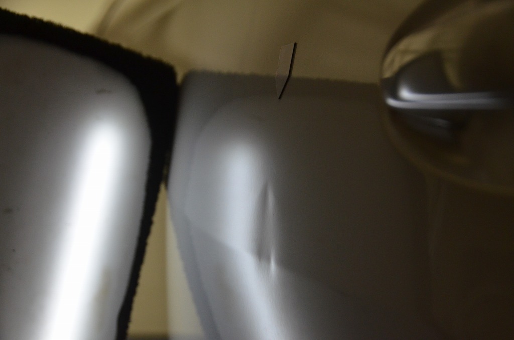 まずはこちら・・・いつの間にかのドアパンチ痕とのことですが当初ディーラーさんにご相談するもやはり!?鈑金塗装の判断で見積もり額20万~の回答にがっくし(T_T)