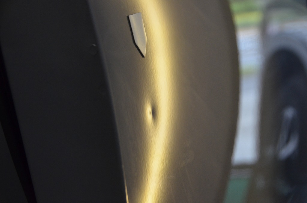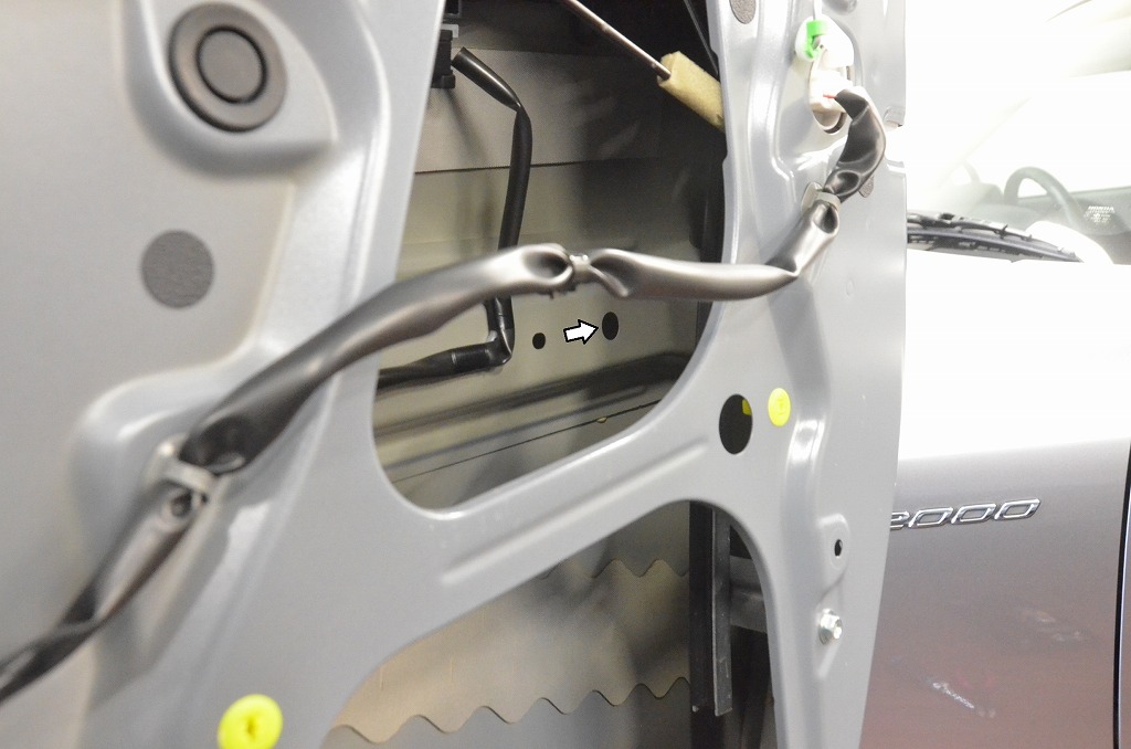 運転席ドアのアウターハンドルの少し下に芯のあるシャープデントです、場所的に工具アクセスが微妙かな?と思いましたが案の定!?内張りを外さないと工具アクセス不可でした(>_<)