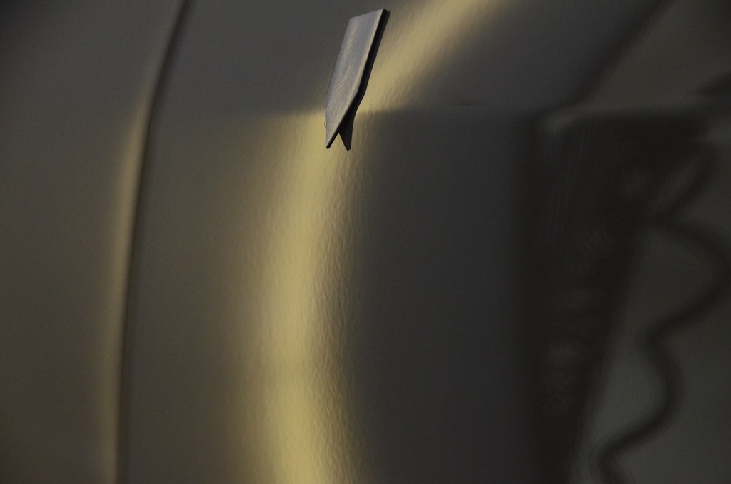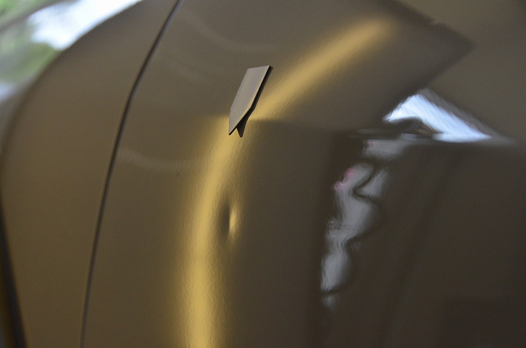 ドアの前方、プレスラインよりやや下部に典型的なドアパンチ痕のようですね・・・工具アクセスも良好な場所なので短時間で”なかったこと”に出来るかと思います。